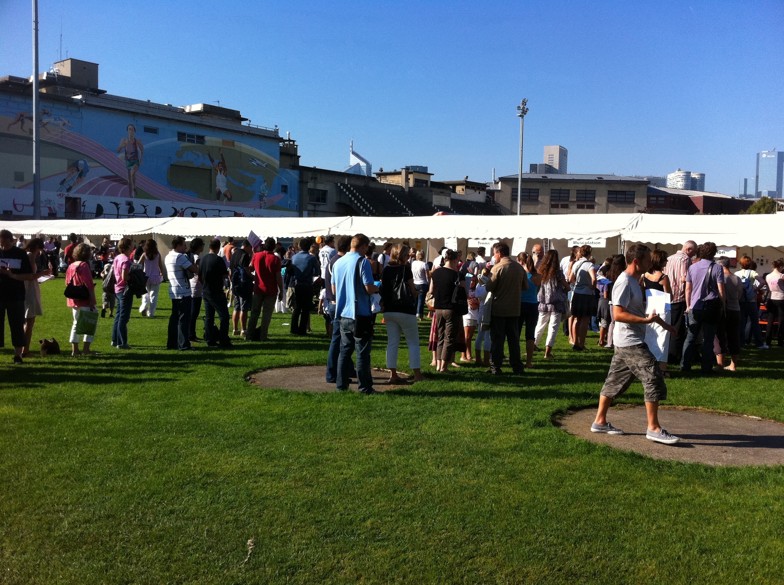 Superbe l’initiative de Courbevoie de faire de ce WE, dans le magnifique stade JP Rives, une journée portes ouvertes avec des stands pour toutes les associations de la commune, qu’elles soient sportives, culturelles, religieuses ou sociales. Plus de 100 associations présentes. On peut s’inscrire pour toutes les activités (plus d’une heure d’attente pour le tennis, le rugby, la natation et l’athlétisme).