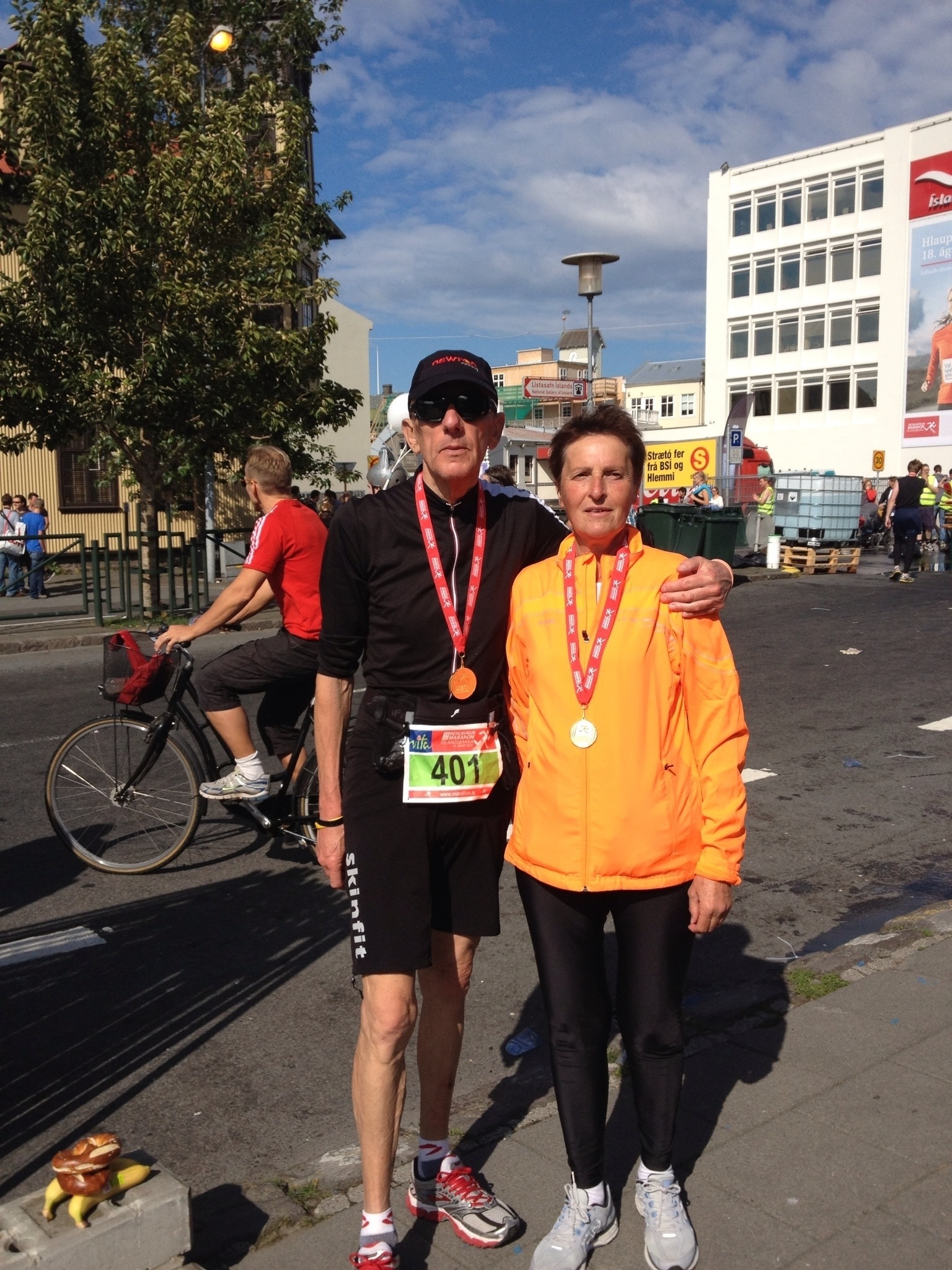 Les médailles récompensant les finishers ornent nos bustes, mais avez vous remarquez nos récompenses reposant sur le trottoir à gauche de la photo: pour chacun, une banane et un bretzel!