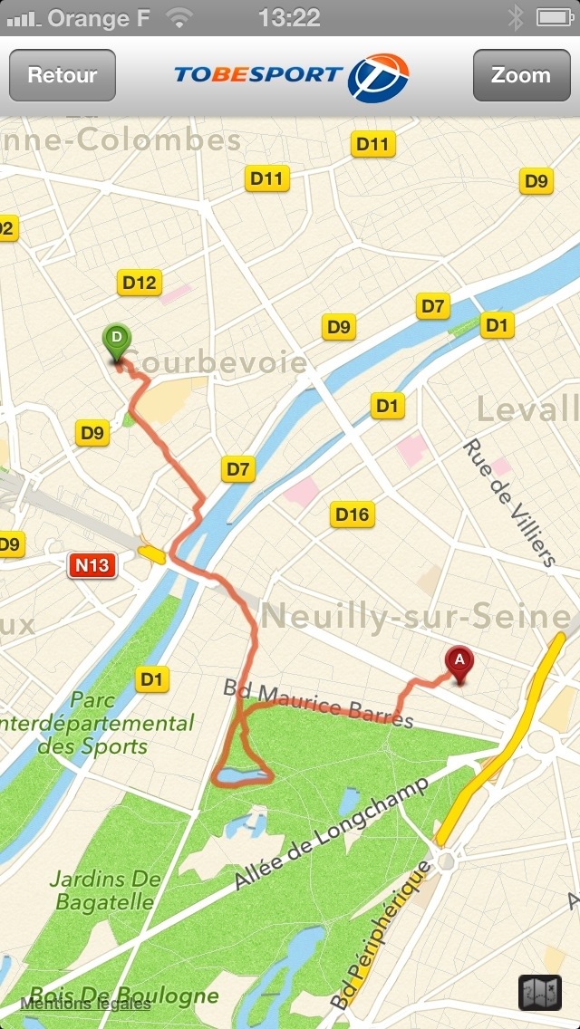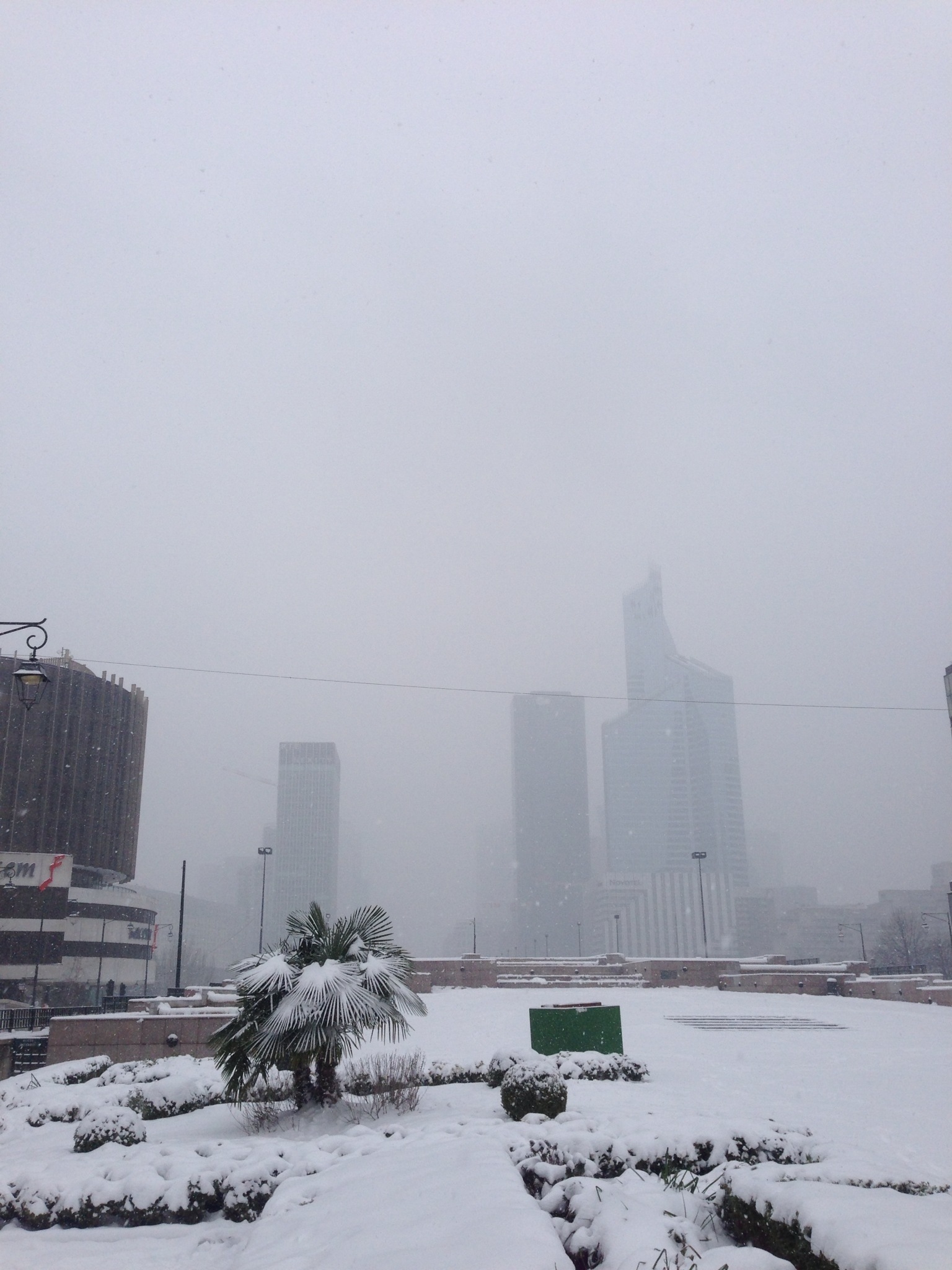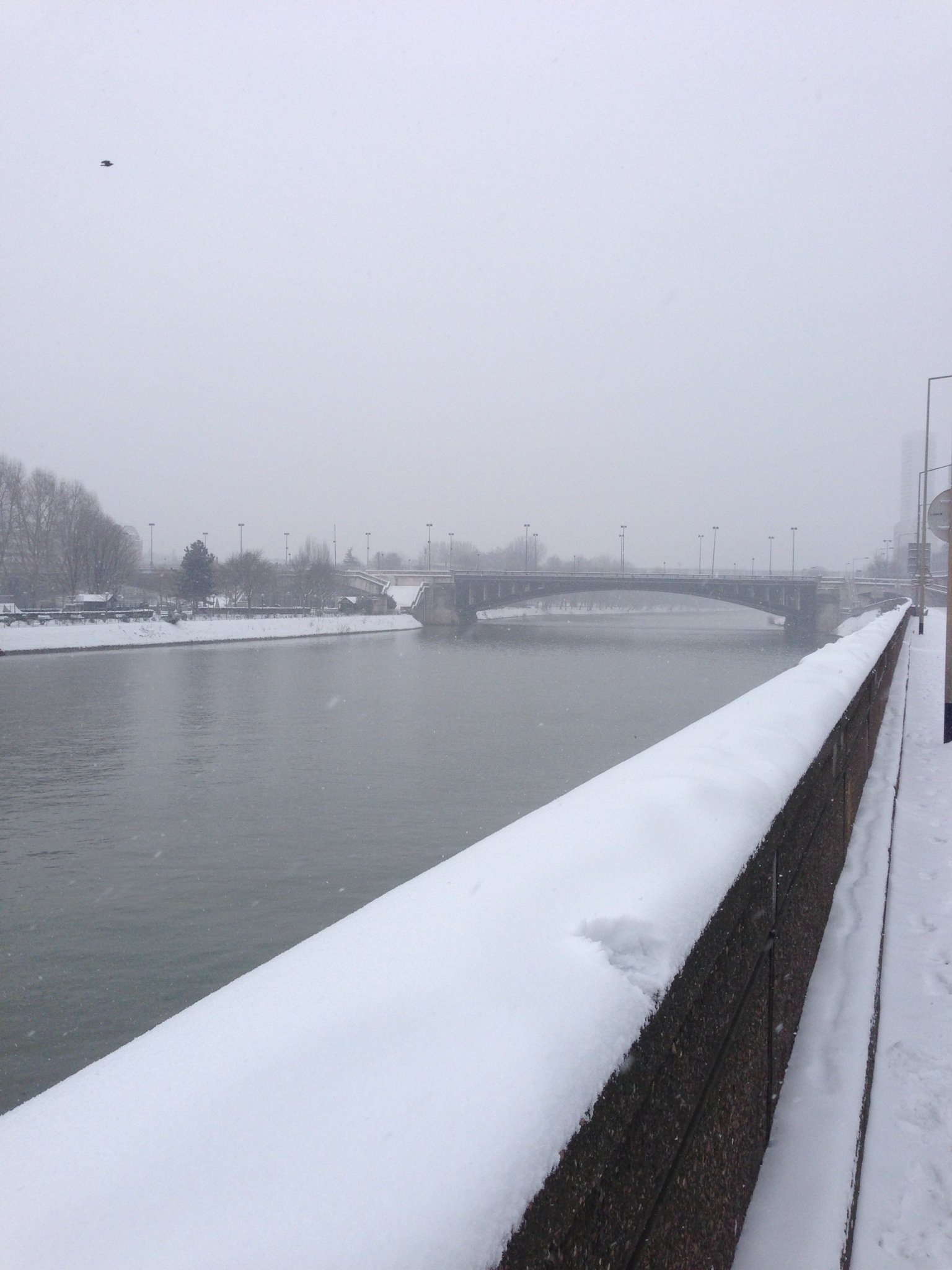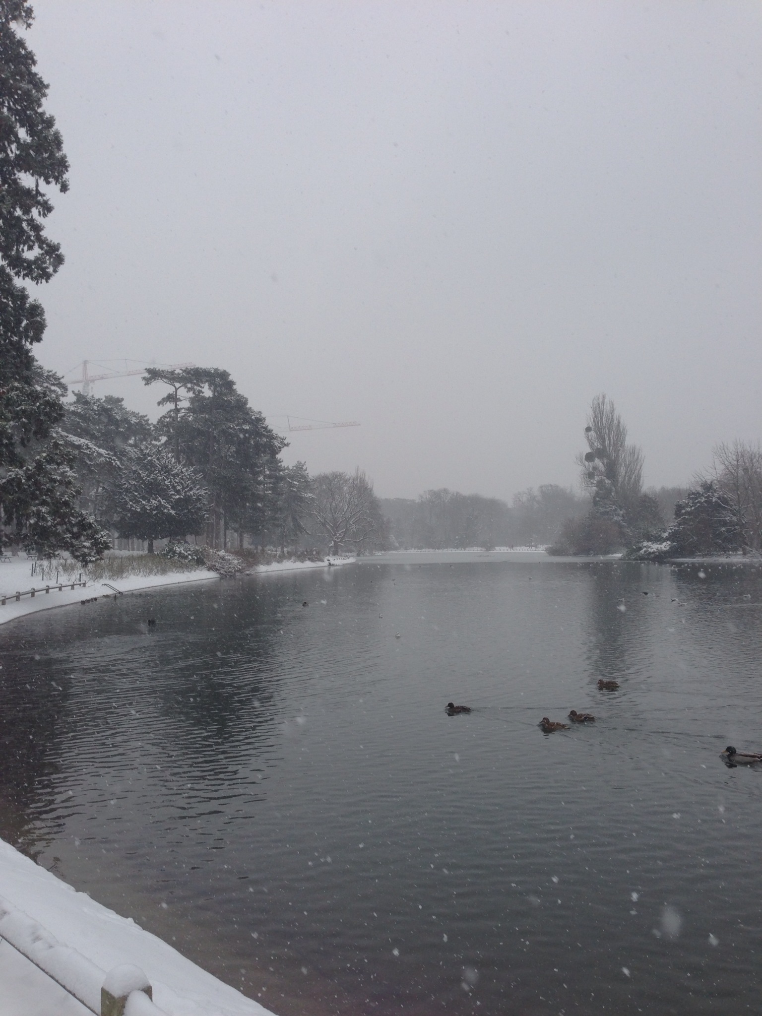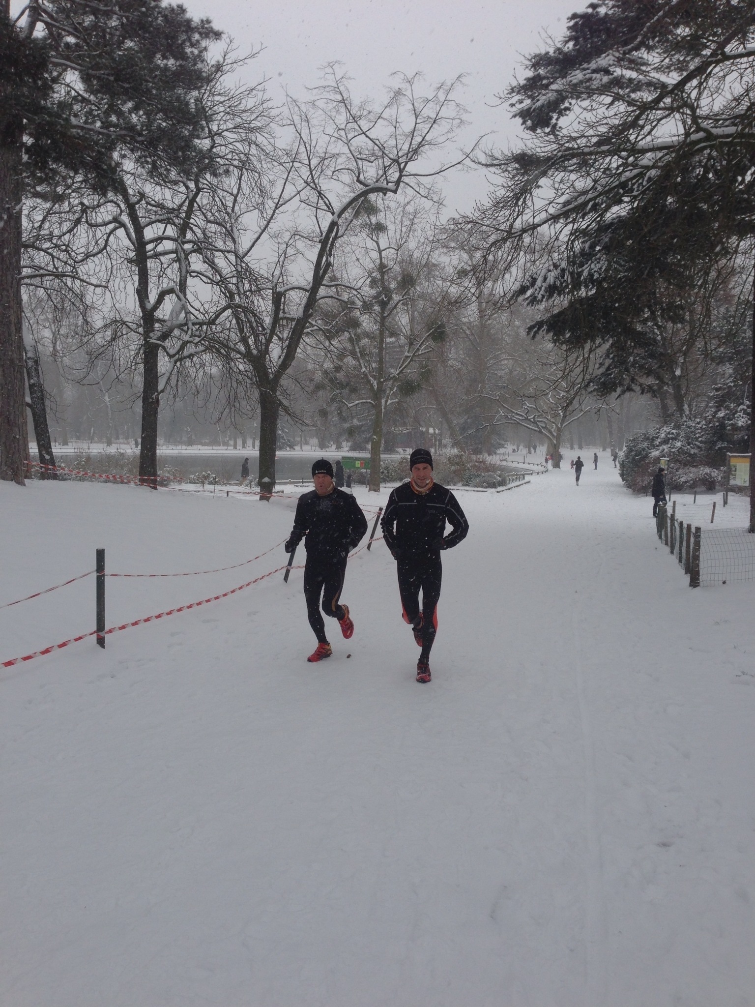 Départ donc que devant chez moi, à Courbevoie, en direction de la place du Vieux Marché à Neuilly avec passage dans le bois de Boulogne. Peu de monde sur les trottoirs et un nombre très limité de véhicules circule dans les rues. Il fait froid et la neige continue de tomber au moment du départ. Courir sur une neige de 10 à 15 cm sur les trottoirs qui n’a pas encore « écrasée » est relativement chose facile, principalement si comme moi on est équipé pour la circonstance de chaussures adaptées. Je pense même que c’est plus facile qu’à Tromsø où la neige était nettement plus gelée. Le passage sur le Pont de Neuilly est assez venté avec une grande sensation de froid, mais l’arrivée au Bois de Boulogne me fait vite oublier cette étape. Magnifique, le Bois est recouvert de son manteau blanc avec un Lac St. James, circuit habituel de nombreux joggeurs, en pleine beauté.