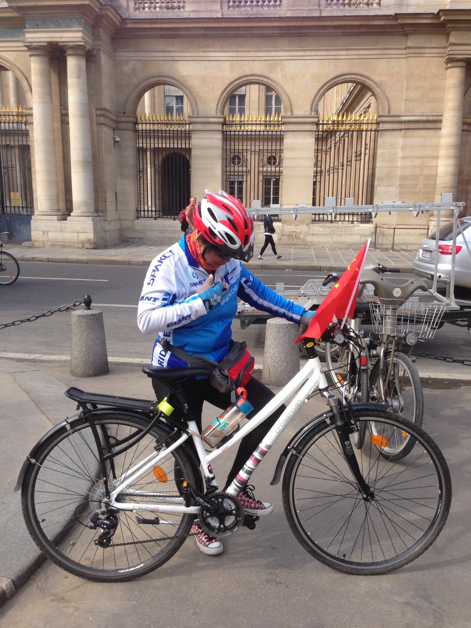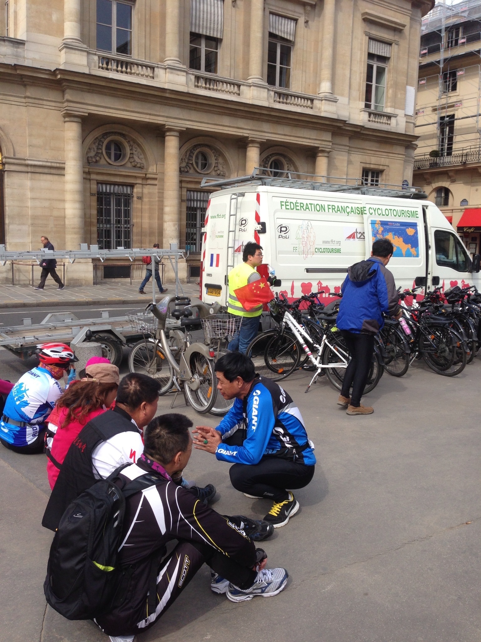 Rencontre insolite, mais très sympathique, aujourd’hui Place du Palais Royal à Paris transformée pour l’occasion en arrivée pour les cyclistes chinois venus de Pékin. Alors, pour la circonstance, Gilbert vainqueur à deux reprises (mais dans l’autre sens) sur ce parcours (en 2008 puis en 2012), était présent pour rendre un hommage aux cyclistes chinois. Précisons que Gilbert, qui engrange encore chaque année 15000 à 20000 kms (les années creuses), à aujourd’hui 76 ans et se porte merveilleusement bien. Pékin / Paris c’est 14000 kms en vélo en 4 mois! Alors pour fêter l’événement un petit cocktail a réuni tout ce monde pendant lequel j’ai eu le plaisir de raconter « mes marathons » à nos amis chinois en français, bien sûr, mais traduit en simultané par un membre de l’ambassade.