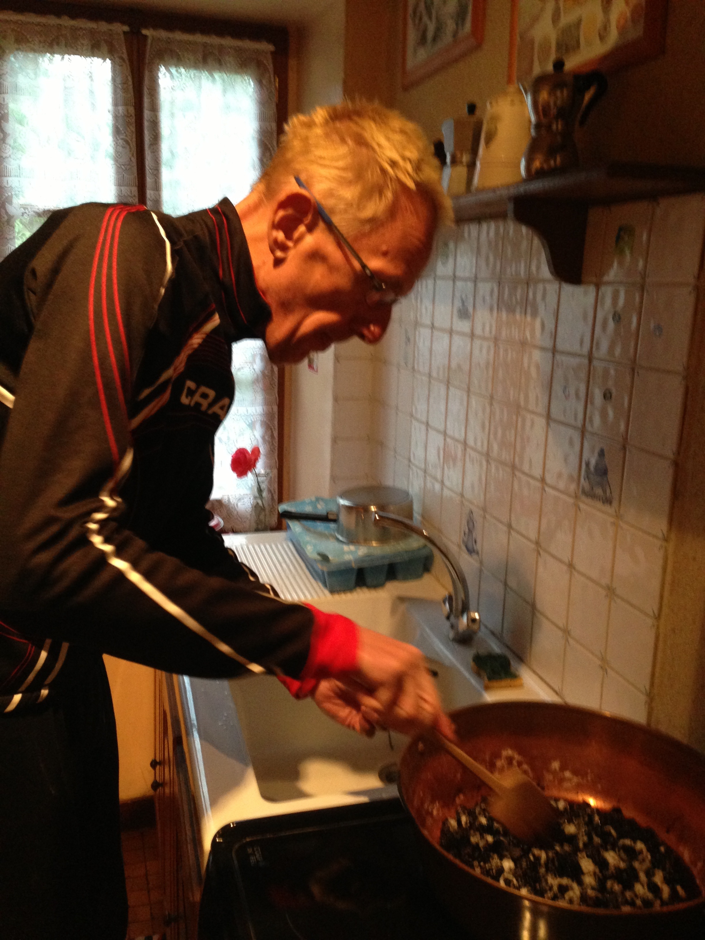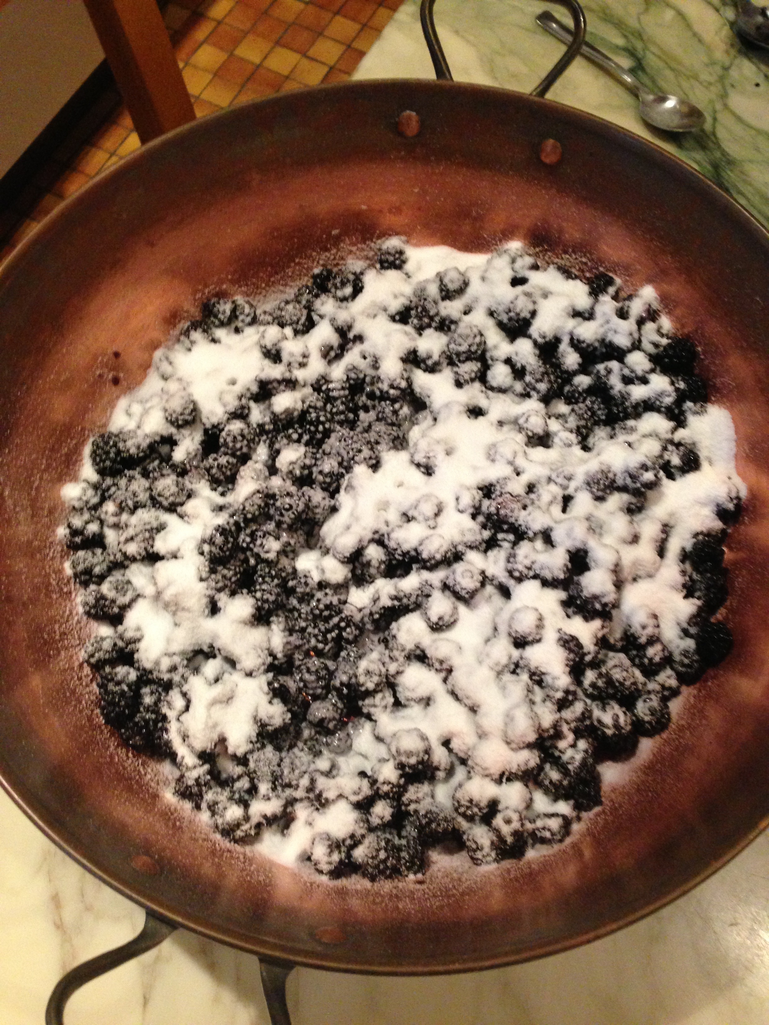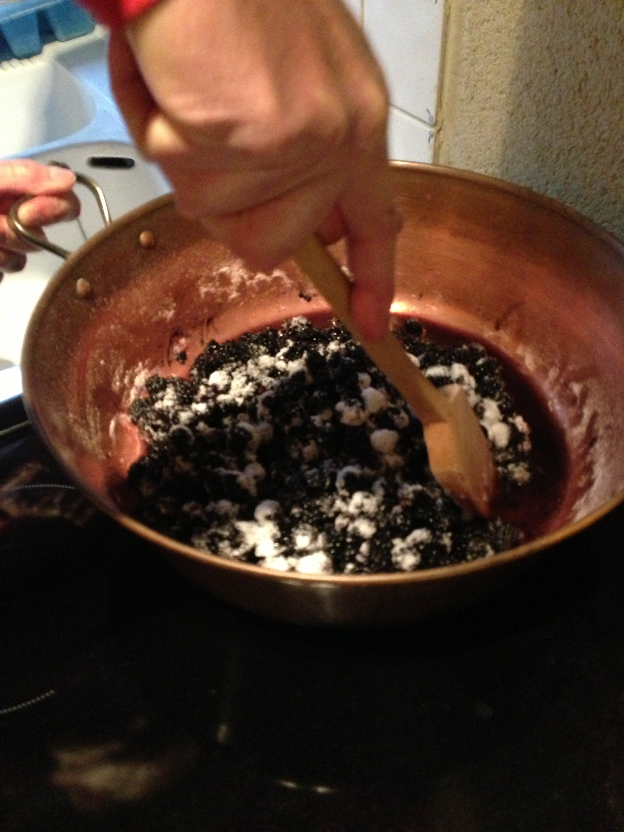 1,5 kgs de mûres sauvages cueillies du jour et lavées (par la pluie) 20 grammes de Stevia 4/5 bouts très fins de peau de pomme (pectine) 30 mns environ de cuisson