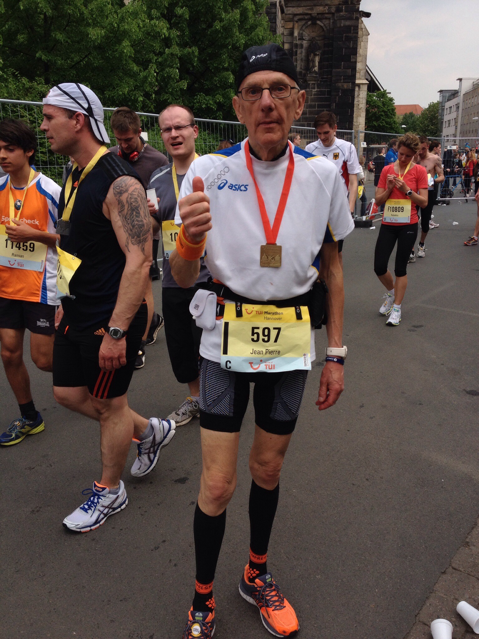 Mon pote DareDare est toujours de bons conseils. Après Barcelone, c’est Hanovre qu’il m’avait recommandé de courir et je suis vraiment très heureux d’avoir suivi ses conseils. Cette épreuve, qui regroupe 3000 coureurs sur le 10kms, 7000 sur le half et 2000 pour le marathon est vraiment super sympa. Il faut aussi compter sur un grand nombre de rollers et des courses enfants. Le parcours traverse une ville méconnue mais verdoyante et permet de découvrir beaucoup de quartiers. Un public chaleureux, toujours prêt à vous être agréable, est bien présent tout du long. L’organisation est très bonne, les ravitos bien approvisionnés, et a l’intelligence de regrouper le start, le finish et l’expo en un seul lieu central de la ville, le Neuen Rathaus. Le petit accroc concerne la rencontre au 22ème des coureurs du half et des marathoniens. Pas très agréable, mais ça ne dure que 3kms. Et puis il convient aussi de signaler un temps parfait pour courir ce qui n’était pas forcément prévu.