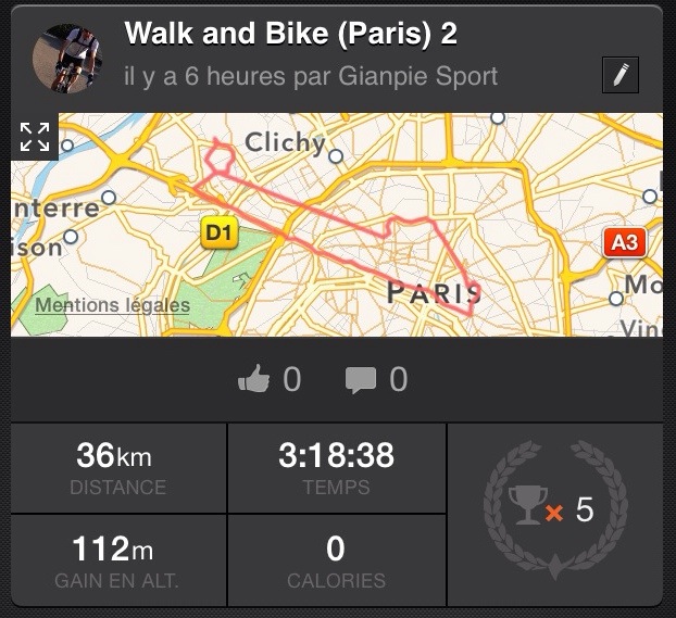 Aujourd’hui c’était donc ma deuxième sortie sur mon engin, Courbevoie / Place de la République (où j’ai distribué des flyers du Turin Matathon aux inscrits des 10kms de l’Equipe) via la Place Clichy, la Place Pigalle et le Bd Magenta. Le temps de remarquer tous les efforts en matière de pistes réservées aux vélos consentis par la ville. Bravo, mais il ne faut surtout pas s’arrêter en si bon chemin et imiter pour cela ce qui se fait de mieux dans certaines grandes villes (HH par exemple!). Pour le retour, direction Bastille pour un petit bonjour à mon ami Philippe du magasin UNIK (je recommande vivement ce magasin de Running, on y est toujours parfaitement bien conseillé et le choix est grand) puis Rue de Rivoli, Concorde, Champs Elysées, Avenue de la Grande Armée, la Défense et Courbevoie. 36kms à un rythme » de « sénateur » (comme on dit) puisque quand je roule dans Paris, comme d’ailleurs quand je cours, c’est pour le plaisir et je n’hésite pas pour cela à toutes sortes d’attitudes (Starbucks, magasin, pâtisseries…). Mais vraiment je suis satisfait et heureux de mon nouveau jouet!