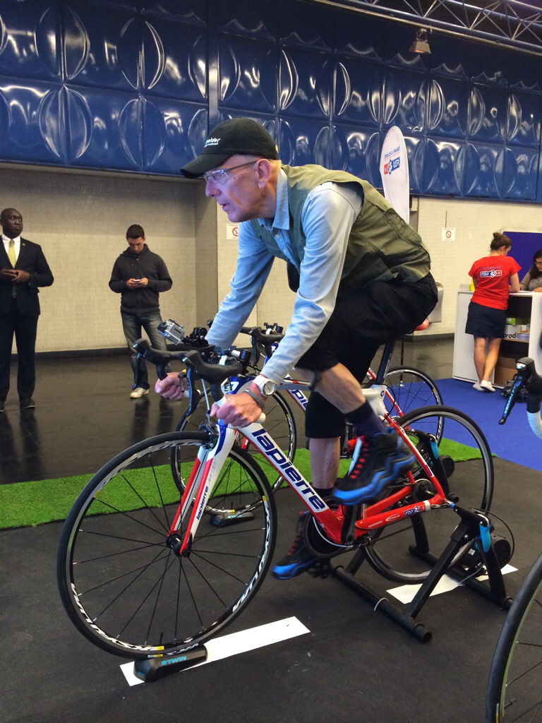 Today, la FDJ organise un jeu/concours à la station Miromesnil du métro parisien. Il s’agit de pédaler devant un écran où défile une route (descentes, montées, pont…) et des obstacles.