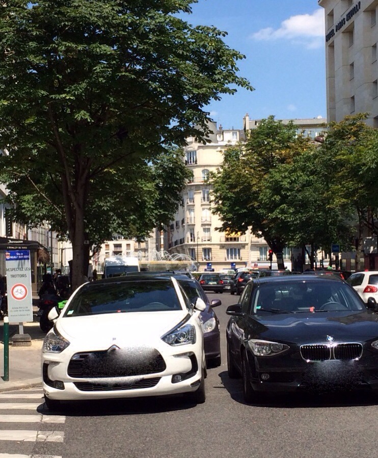 C’est un constat que j’avais déjà fait mais maintenant que je circule tous les jours en bike à Paris je confirme. La palme du mauvais comportement revient aux autos stationnées en double file et qui obligent le cycliste à prendre de grands risques quand on connaît la circulation. Motif du double stationnement? Baguette de pain, paquet de cigarettes ou enfant à l’école. Peu importe, je trouve incorrect de la part des automobilistes d’agir ainsi (on ne voit pas cela dans bon nombres d’autres capitales) et invraisemblable que ces contrevenants ne soient jamais verbalisés. Que dire, par exemple, de ce panneau sanctionnant gravement le cycliste alors qu’une voiture en double file était garée à proximité (son proprio bouffait tranquilos dans un resto à proximité).