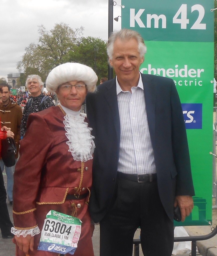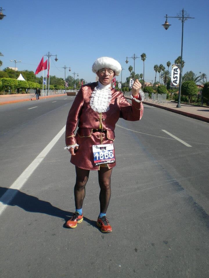 73 marathons sera la perf. réalisée par mon ami Jean Claude (mon jumeau … ou presque) dimanche prochain à l’issu du marathon de Rio. Super! Encore plus que ne le laisse supposer le nombre car à chaque fois JC court travesti. Généralement en Mozart, c’est le « costume » qui l’a rendu célèbre dans le monde entier au point de figurer dans les journaux locaux (presse écrite et TV) et aussi sur des affiches comme à Tokyo. Je l’ai aussi vu en Conchita à Prague mais aussi « tomber » dans les bras du Maire de Jérusalem avant d’être projeté à terre par les gardes du corps de celui-ci puis d’être invité par le 1er magistrat de la cité. Un surhomme plein de modestie et de gentillesse qui réalise tout de même, malgré son grimage, moins de 5 heures pour les 42.2.