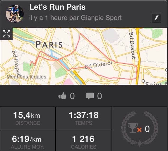 J’ai donc participé ce matin à ma première session du groupe « Let’s Run Paris » . Une quarantaine de personnes pour ce Run de 15 kms avec pas mal de nationalités présentes. Ce qui rend encore plus sympa cette séance courue au rythme de 5 ou 6 mns/km, au choix. Et puis le soleil était bien au rendez-vous. Vraiment plaisant, même si le nombre élevé de participants oblige à quelques arrêts « prudence » lors de la traversée des grands axes routiers. Dommage que les sessions du lundi soir à 20h soient fixées à l’opposé de mon domicile parisien, sinon j’y participerais volontiers comme je le ferai désormais chaque samedi quand je serai présent sur la région. J’ai vraiment aimé. Merci Dare de m’y avoir invité.