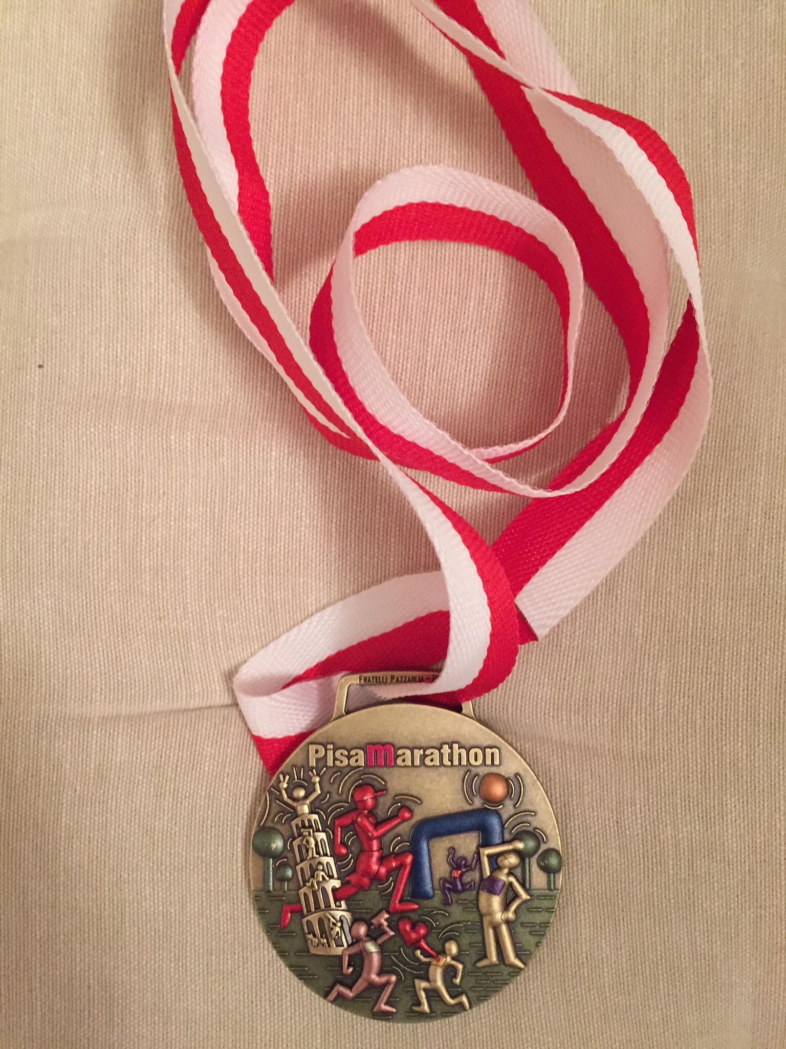 S’agissant du Matathon, c’est une autre affaire. L’organisation est correcte mais le parcours laisse vraiment à désirer. 3 kms en ville, en début de course, puis zone périphérique et campagne / forêts sympas sur 10 kms, avant d’attaquer 20kms (8 dans un sens, 12 de l’autre) sur le côté d’une grande route très empruntée et dont la circulation n’a été stoppée que dans un sens. Vraiment pas terrible même si la mer est proche (je ne parlerais pas de bord de mer car on se trouve plutôt au milieu des restos, campings et parkings de plage). Enfin retour sur 10 kms sur le bas côté d’une route nationale. Les 2 derniers kms se déroulent en contre ville avec une arrivée devant la Tour, mais en évitant l’ensemble du Duomo, ce qui est vraiment dommage. Aucun spectateur (le Matathon est complètement « ignoré » des habitants) et absence totale d’animations sur le parcours. Pisa mérite mieux!