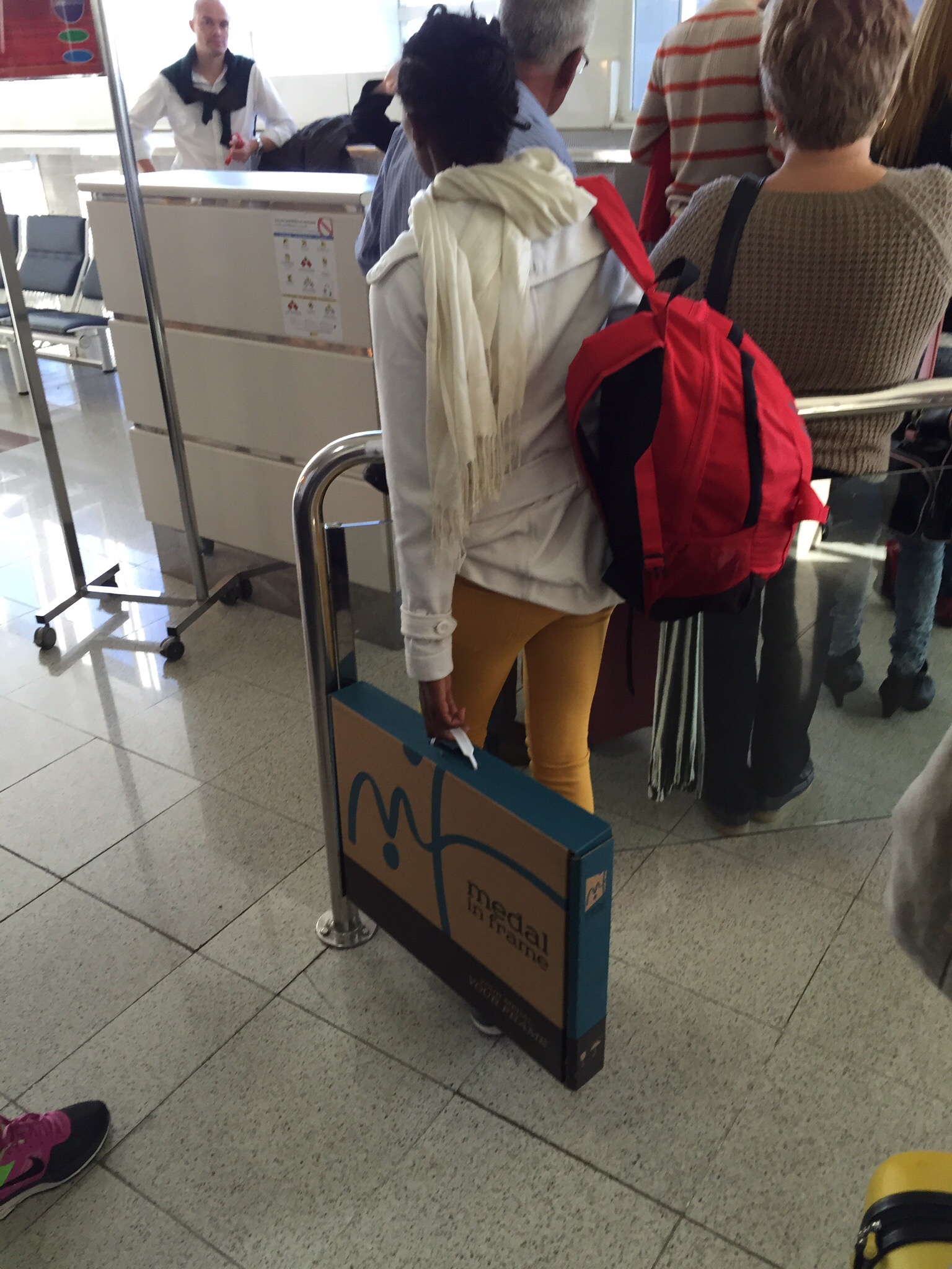 Le hasard a voulu qu’au retour, hier, elle soit assise juste devant moi dans l’avion (sa copine 10 rangs plus loin). Nous n’avons pas pu discuter (barrière de la langue) mais elle a eu la gentillesse de me montrer la magnifique médaille qu’elle a gagnée. Rien a voir avec la mienne!