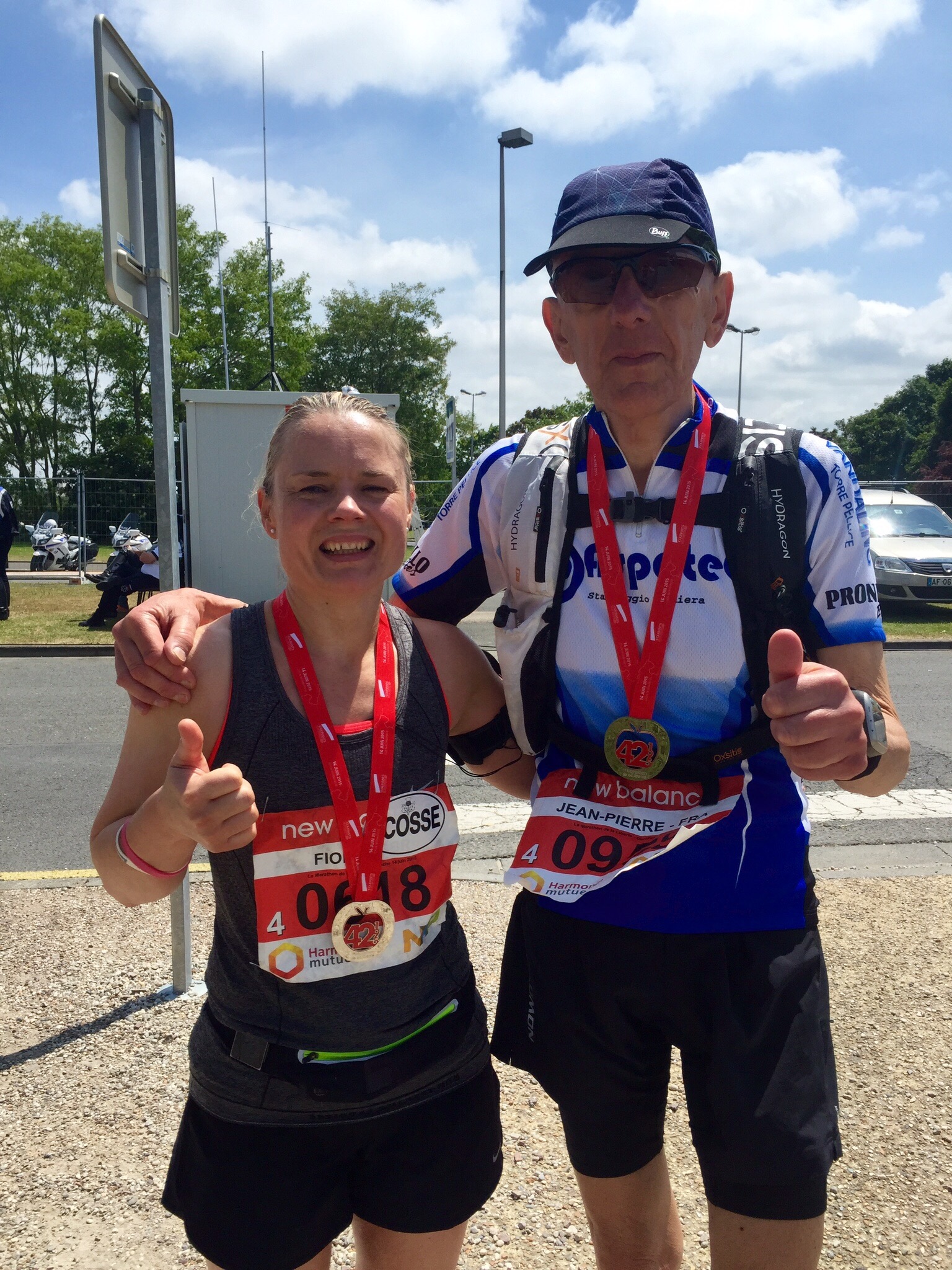 Gianpie, parti seul à ce niveau de course, devait une fois de plus être confronté à une aventure aussi marquante qu’émouvante. Vers le 25ème km mon attention est attirée par une runneuse en plein désarroi. Je lui demande ce qui se passe. Elle m’explique en anglais (Fonia est Écossaise de Glasgow) qu’elle a mal aux muscles des cuisses (ce sont ses cris à chaque pas qui ont attiré mon attention), qu’elle est épuisée et qu’elle ne pourra sûrement pas relier l’arrivée. Puis elle se met à pleurer et me dit qu’elle court pour rendre hommage à son mari, décédé d’un cancer (35 ans) il y a 6 mois et qui était grand marathonien. J’en ai la larme à l’œil et même aux deux yeux. Je suis vraiment ému. Je me ressaisis et je lui promets que si elle le souhaite nous passerons ensemble la ligne d’arrivée. Le temps limite imparti pour terminer étant fixé par l’organisation à 5heures, nous alternerons 1km de course et 500m de marche. Nous rallierons l’arrivée ensemble en 04:50. Une fois la ligne d’arrivée franchie, Fonia pleurera d’émotion en me remerciant chaleureusement. Mais le plus heureux des deux à cet instant est peut être Gianpie. Quel bonheur d’avoir aidé cette jeune Ecossaise dans sa quête. J’en suis encore tout ému. Un seul regret à la fin de course. Je n’ai pas eu de nouvelle de mon pote Yannick.