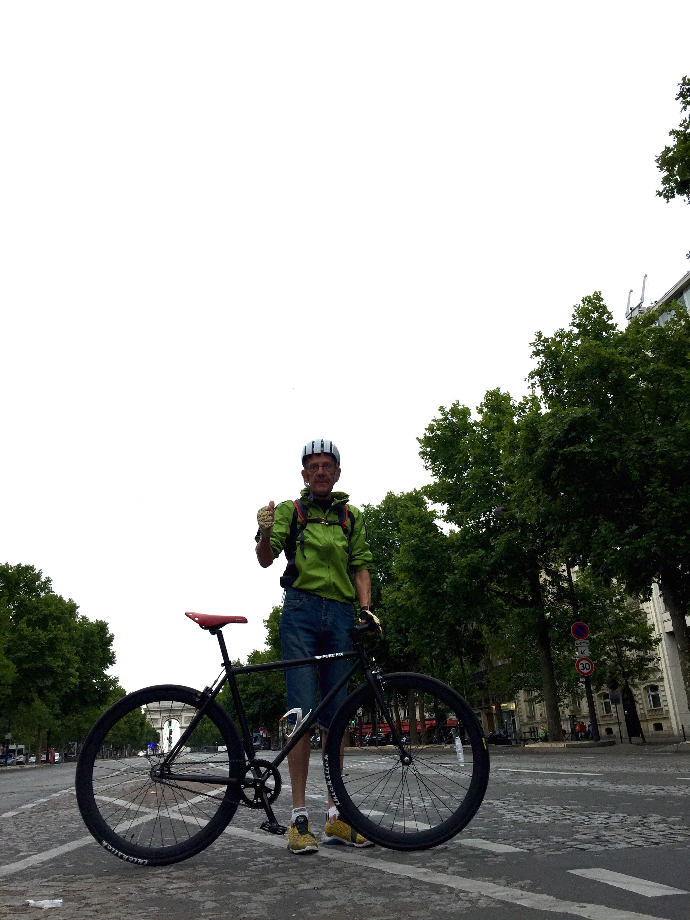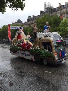 Une journée commencée tôt le matin pour moi jusqu’à cet instant de l’arrivée des coureurs sur le circuit final. Par expérience je sais qu’il est possible, et très agréable, de circuler en vélo sur le parcours parisien qui sera emprunté par les coureurs quelques heures plus tard. Les routes sont interdites à la circulation mais les bikers sont tolérés par les forces de l’ordre. Les spectateurs, déjà nombreux le matin de l’épreuve, ainsi que les stands des sponsors garnissent le décor. On s’y croirait!