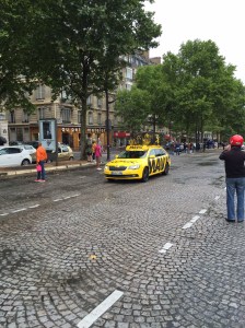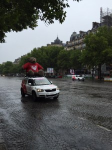 Et puis, sur le coup de 16h, soit au moment où la caravane du Tour entre sur le circuit final par l’avenue de la Grande Armée, une pluie diluvienne et froide s’abat sur nous. Pas agréable du tout. Mon salut viendra du store de la vitrine d’une boutique qui, c’est sûr, n’a jamais eu autant de visiteurs!