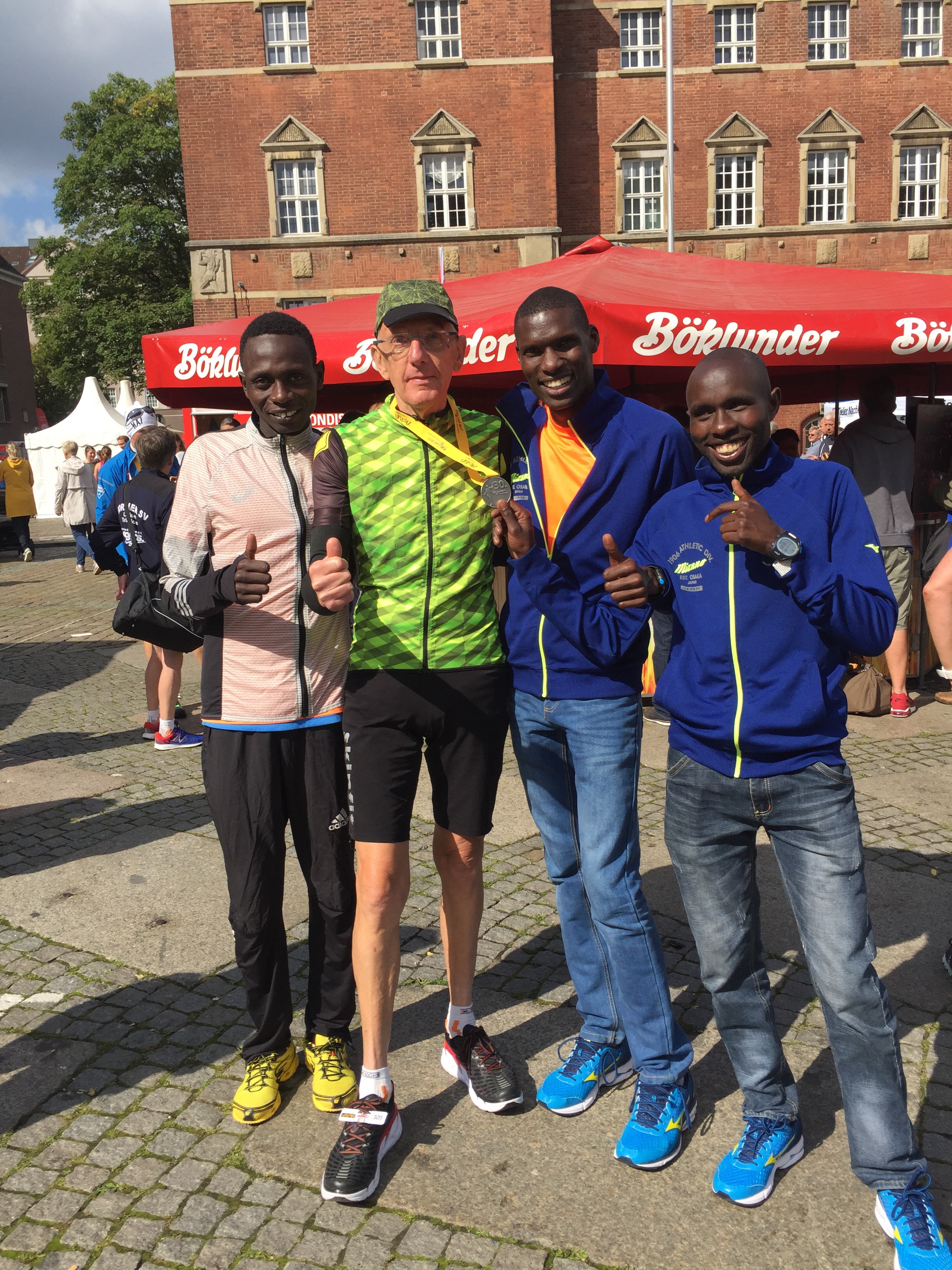C’est incroyable la gentillesse affichée par les coureurs africains et notamment les Kényans. À mille lieux d’autres sportifs qui pourtant gagnent des sommes faramineuses au regard de ce que touchent les champions marathoniens. Hier, j’ai encore été touché par la disponibilité et la courtoisie des 3 premiers du Kiel Halb marathon. De gauche à droite sur la photo, Mengistu Zelalem (classé deuxième), Patrick Mugur Ereng (premier en 01:02.39) et Danil Kemoi (troisième) qui lui restera en Allemagne jusqu’au marathon de Berlin où il sera Pacer. ´