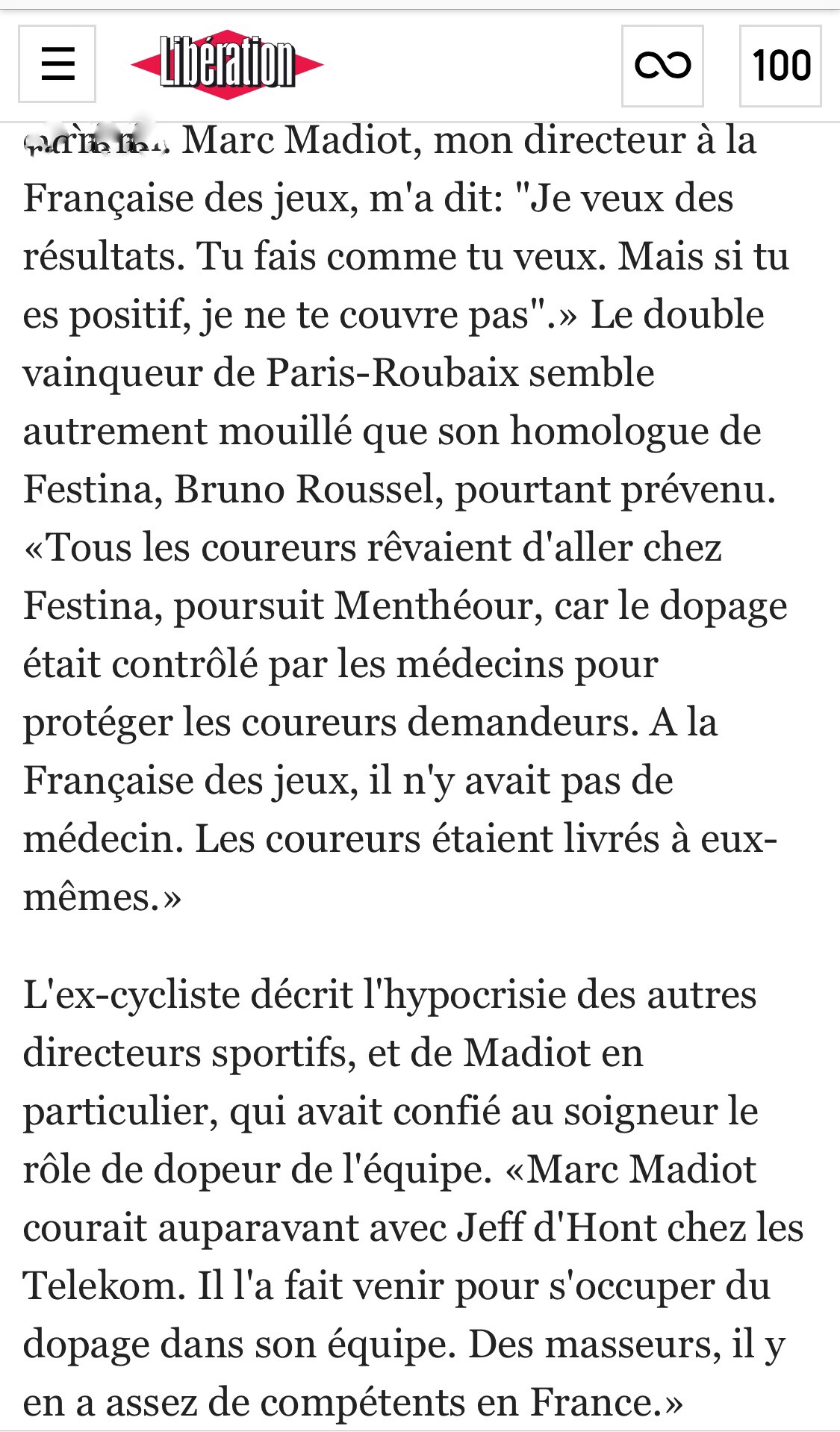 Festina avait les mêmes habitudes que tout ce qui est décrit : les centrifugeuses, l’EPO, la dilution du sang,… Ca existait déjà. Ce n’est pas Armstrong qui les a inventés.