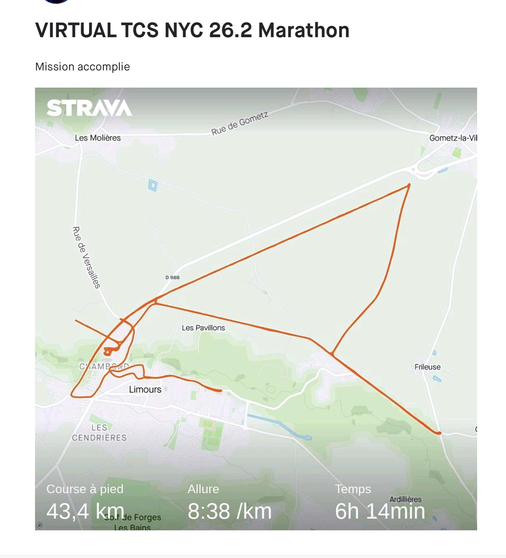 L’homme qui vise 100 marathons, avant de se mettre (peut-être) en retrait sur la distance, a encore frappé mais cette fois là où je ne l’attendais pas. Alors que nous avons, lui et moi, sillonné les parcours marathons du monde et que désormais pour cause de confinement j’en suis « réduit » à la pratique du vélo, mon pote GG continue sa quête cap en courant des marathons virtuels le long de la coulée verte de l’Aérotrain . Pas moins de 4 en octobre/novembre (Londres, NYC, Washington et Édimbourg).