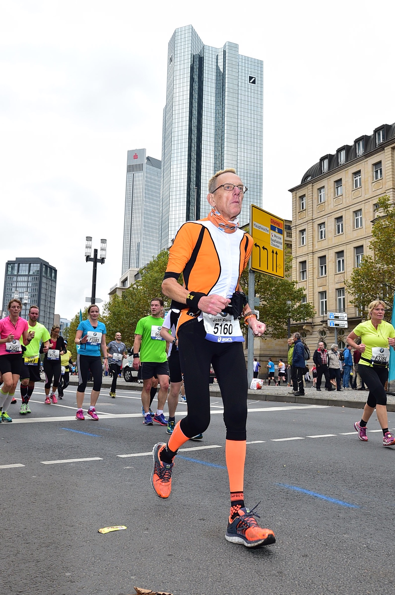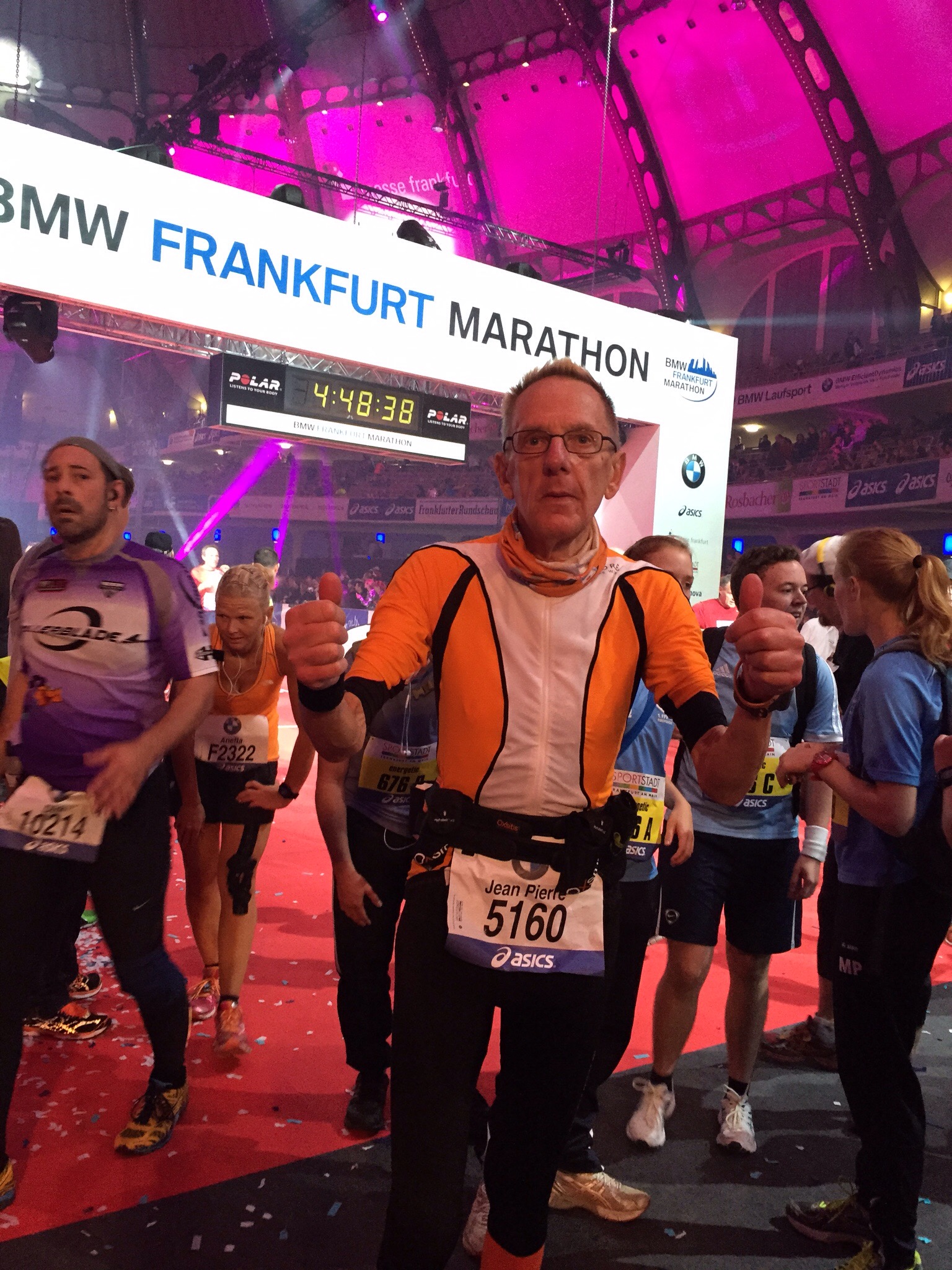 Décidément après le matathon de Köln, couru a mi-septembre, qui m’avait franchement decu, j’ai la chance d’enchaîner des courses plus superbes les unes que les autres. Marathon des Écluses, fin septembre, Marathon d’ Amsterdam la semaine passée, et, en ce dimanche 26 octobre, Frankfurt. Vraiment un excellent marathon, tant sur le plan du tracé (la ville vaut le déplacement avec ses monuments anciens jouxtant la Sky Line), que sur ceux de l’organisation et de l’ambiance (très nombreux public d’un bout à l’autre). L’égal des plus grands. Et puis le final, à la Festhalle, est unique. Si on ajoute que le temps a été idéal vous comprendrez le plaisir intense ressenti.