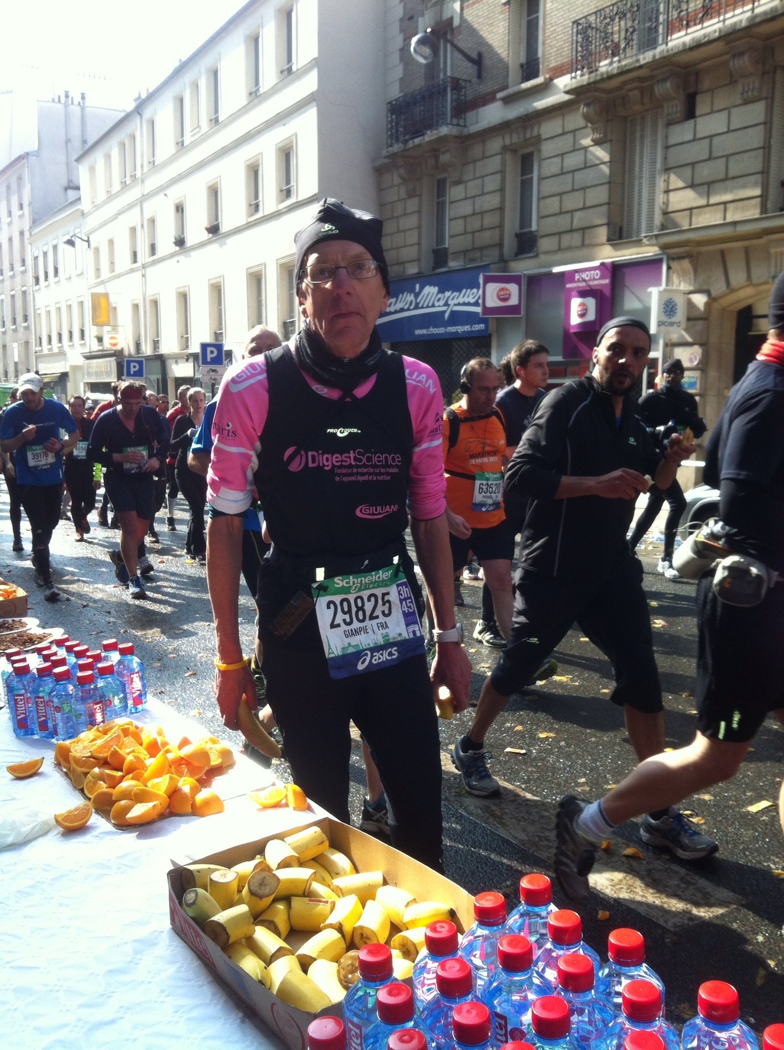 45000 runners au start ça fait beaucoup de monde, même si le système de départ par vagues s’est montré assez efficace. Par contre, quelques goulets d’étranglement ont fortement ralenti l’allure, et puis les 8 derniers kms, essentiellement dans le Bois de Boulogne, ont été assez pénibles. Impossibilité pour moi de courir correctement compte tenu du nombre important de coureurs, certainement mal préparés, qui marchaient. Vraiment très chiant. Ce sont les dommages collatéraux inévitables compte tenu du nombre (trop) élevé de participants (50000 inscrits). Côté parcours, il est connu, retenu depuis des années, avec deux traversées de bois (Vincennes et Boulogne) où les spectateurs sont complètement absents. Un peu triste mais au moins ça permet de pisser à l’aise. L’organisation (service d’ordre, ravito…) a été, en règle générale, tout à fait correcte. Dans l’ensemble, il s’agit d’une belle épreuve qui traverse quelques endroits magiques, mais qui manque tout de même de consistance pour être classée l’égale des grands marathons. Je parierais d’ailleurs que l’organisateur ne voulant pas (ou ne pouvant pas) modifier son concept mise sur le nombre élevé de participants, notamment étrangers (plus de 100 nationalités présentes), pour faire de cette course une référence. En ce qui me concerne, je suis satisfait de ma course et surtout de la manière dont je termine, sans fatigue et sans douleurs musculaires, au contraire de Rome il y a trois semaines où j’avais modérément été sujet à ces maux. Je suis prêt à repartir. Ce sera à Londres dans 15 jours. Mais d’ici la, dimanche prochain, je devrais faire mon retour sur cyclo-sportive (La Blé d’Or à Lèves) sans un seul km d’entraînement. On verra bien. L’essentiel, pour moi, c’est d’avoir envie et de se faire plaisir!