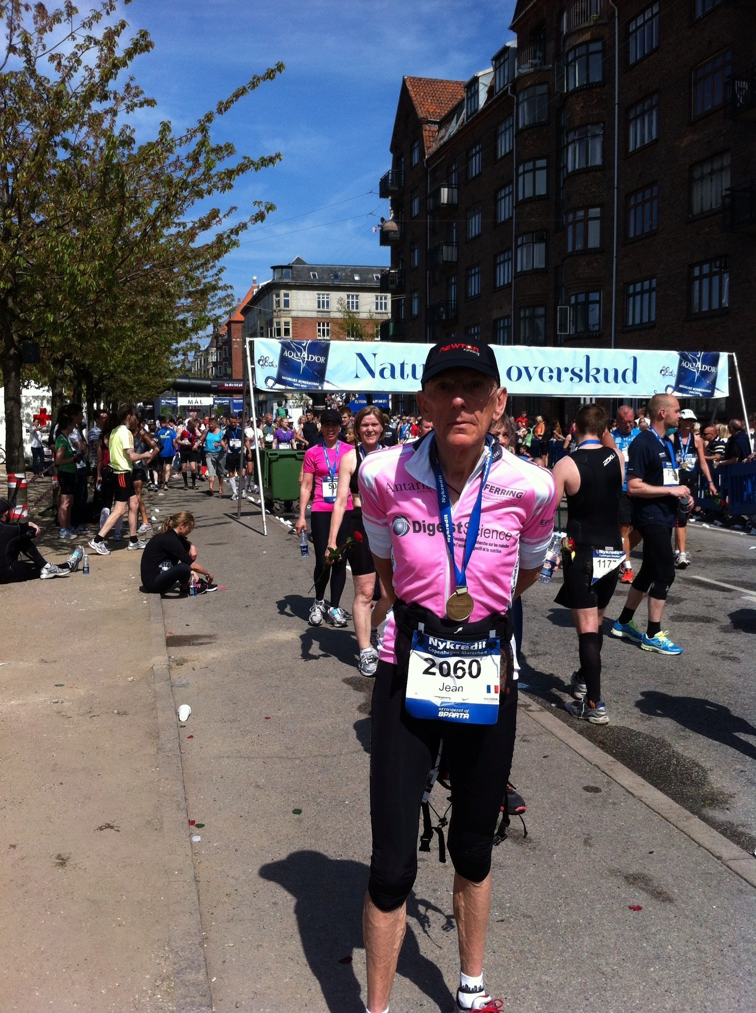 S’agissant de ma course, ne suis pas mécontent du tout car hormis les 7/8 premiers kms, le temps de s’échauffer un max, je n’ai pas trop souffert dans ce marathon super. Super par le parcours avec en prime du soleil et de la chaleur ce qui tranche avec la journée froide et pluvieuse d’hier, je l’ai déjà dit. Les Danois, je les trouve extra, même si au 15 ème je me suis retrouvé par terre pris en sandwichs par deux mastodontes comme ils le sont généralement. Un peu brutaux mais finalement tellement sympa et gentil. Je leur pardonne d’autant plus que j’ai pris une forme de revanche après une fin de parcours généralement difficile pour eux et où beaucoup se sont retrouvés à leur tour allongés sur le sol mais en ce qui les concerne par épuisement physique. C’est vrai qu’il faisait vraiment chaud! Donc voilà, maintenant break « marathons » jusqu’à fin juin et séquence vélo. Heureux le Gianpie.